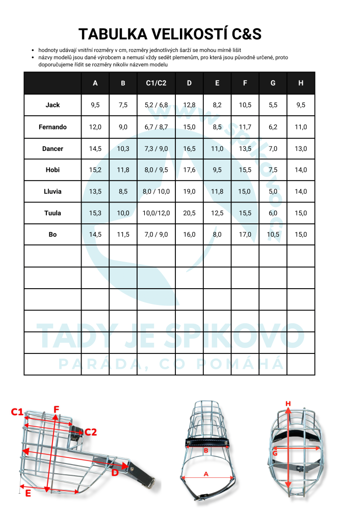 - Základ tvoří jednotlivé modely náhubků německého výrobce Chic & Scharf, se kterými dále pracujeme - tvarujeme je a osazujeme řemínky i nánosníkem z BioThane ® v barvách, které si vybereš a můžeš si tak sladit komplet celou výbavu. Nánosník je možné potisknout libovolným motivem / textem. Stačí v konfiguraci zaškrtnout UV tisk ANO a do poznámky připsat, co si přeješ nechat natisknout. Všechny modely C&S dodáváme s podbradním řemínkem. Důvodem je výraznější vykrojení u krku oproti českým košíkům, díky kterému jsou náhubky C&S velmi variabilní a snadno napasovatelné na široké spektrum psích čumáčků.